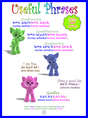 Each word and phrase is presented in Tigrinya with English translation. There is also phonetic form of the words so that you can read Tigrinya using English characters.